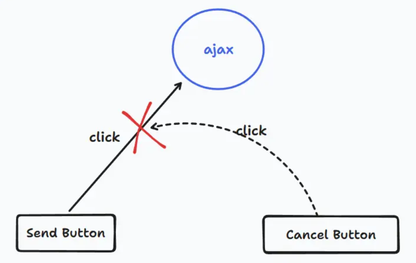 而我们想要实现的取消功能是希望不借助 race 等其他方法并且不发送请求。比如让用户进行控制, 一个按钮用来表示发送请求,一个按钮表示取消 ,来中断 promise 的流程:当然这里我们不讨论关于请求的取消操作,重点在 Promise 上