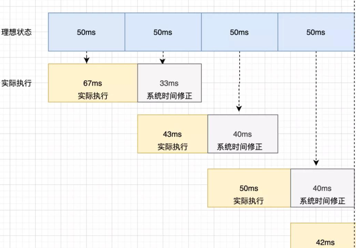 当每一次定时器执行时后,都去获取系统的时间来进行修正,虽然每次运行可能会有误差,但是通过系统时间对每次运行的修复,能够让后面每一次时间都得到一个补偿。