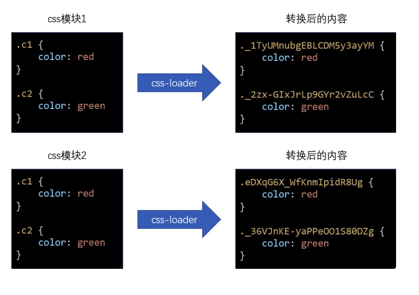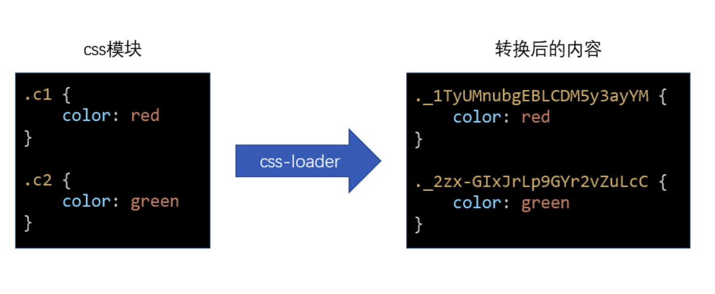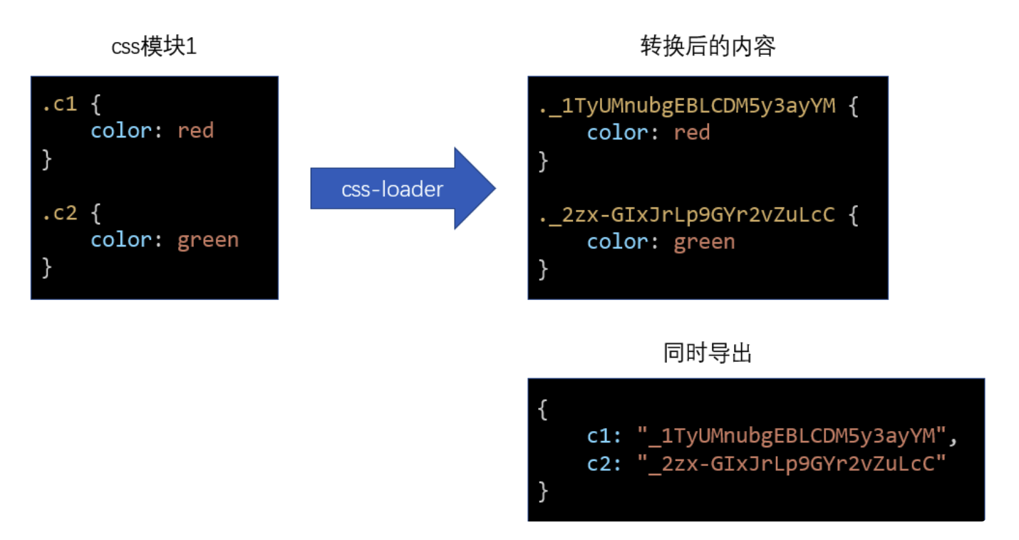 }`;上面的 js 代码是经过我简化后的,不代表真实的 css-loader 的转换后代码,css-loader 转换后的代码会有些复杂,同时会导出更多的信息,但核心思想不变