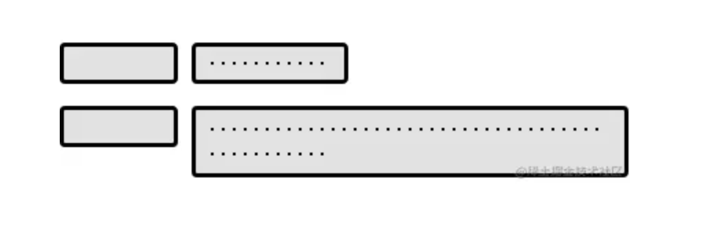 除了上图所示的布局效果外, flex:initial 声明还适用于一侧内容宽度固定,另外一侧内容宽度任意的两栏自适应布局场景,布局轮廓如图下图所示(点点点表示文本内容)。