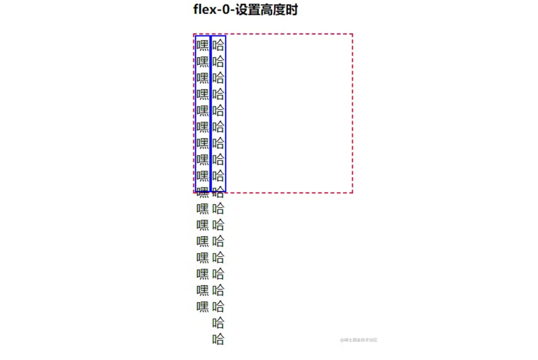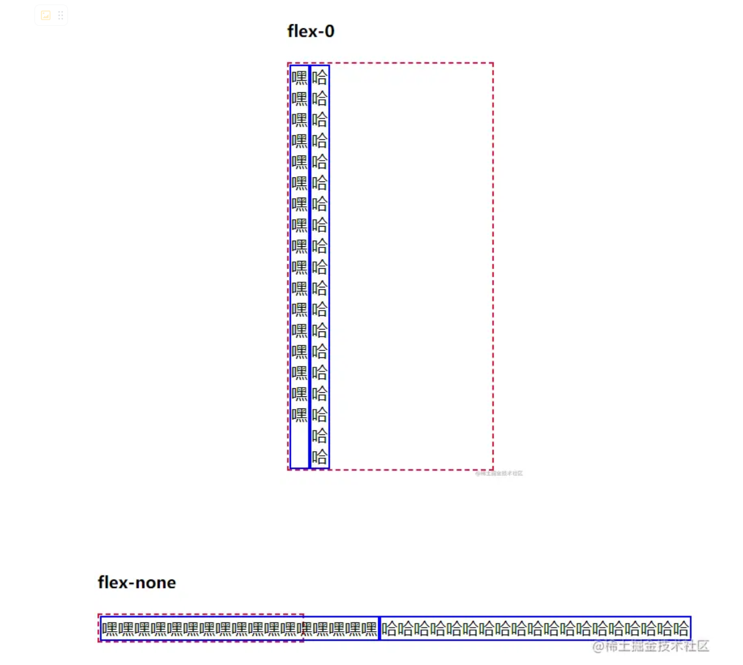 对比看来可以看到 flex-0 时候会表现为最小内容宽度,会将高度撑高(当前没有设置高度,如果设置高度文字会超过设置的高度,如下图)flex-none 时候会表现为最大内容宽度,字数过多时候会超过容器宽度。
