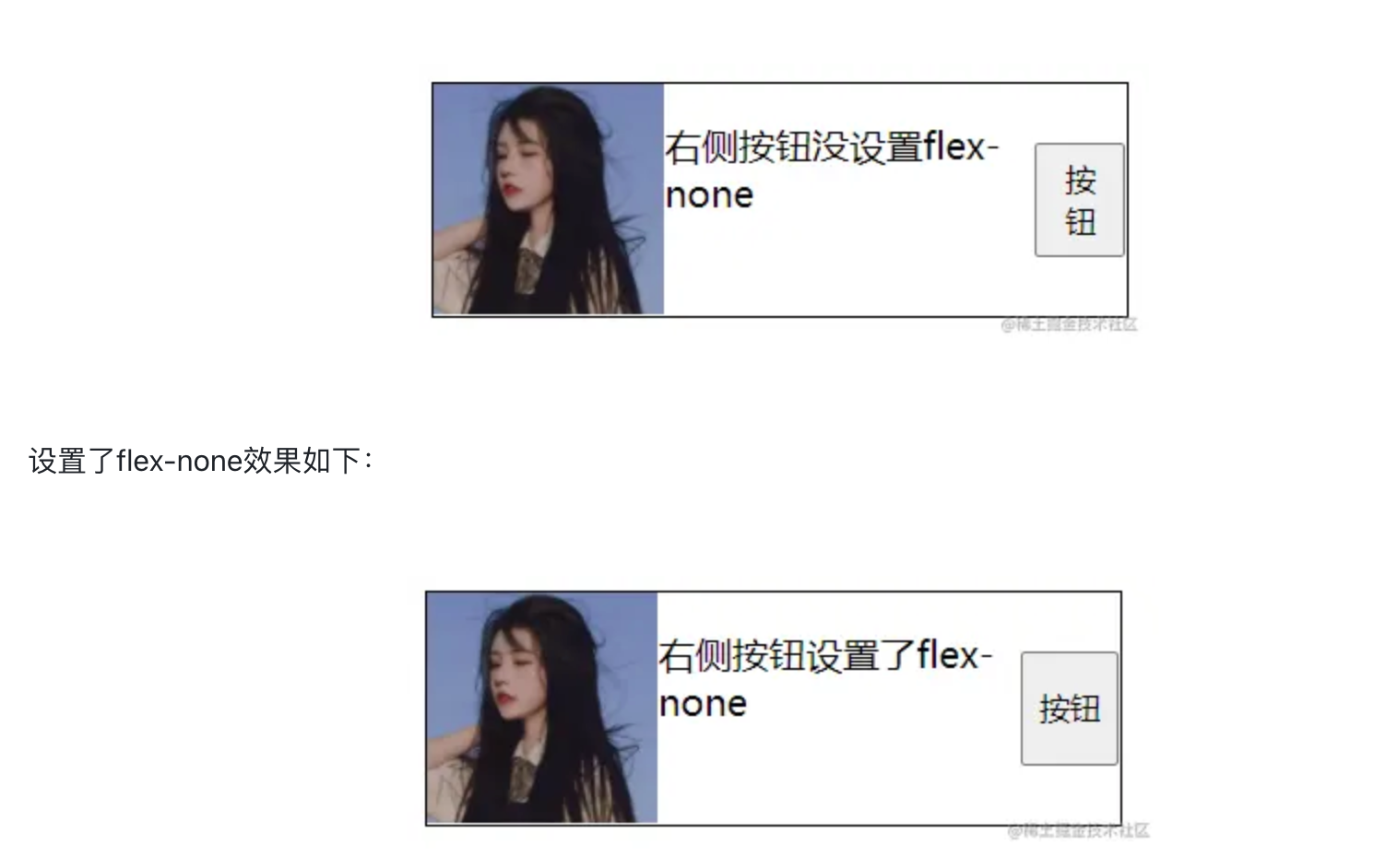 其中上图左侧部分的矩形表示一个图像,图像下方会有文字内容不定的描述信息,此时,左侧内容就适合设置 flex:0 ,这样,无论文字的内容如何设置,左侧内容的宽度都是图像的宽度。