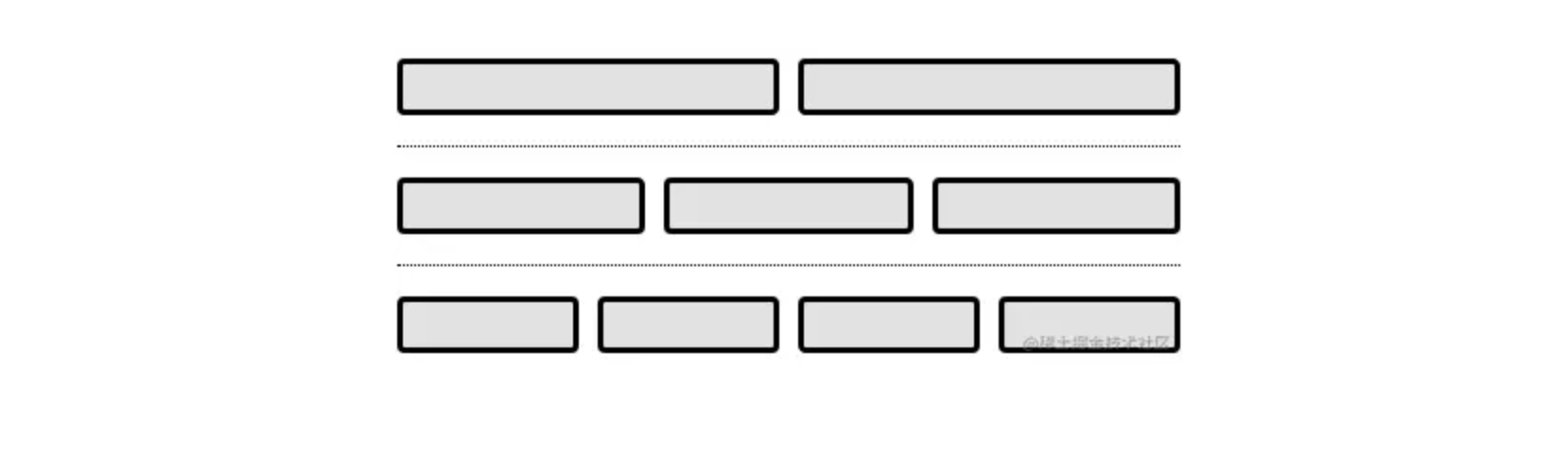 例如所有的等分列表,或者等比例列表都适合使用 flex:1 或者其他 flex 数值,适合的布局效果轮廓如下图所示。