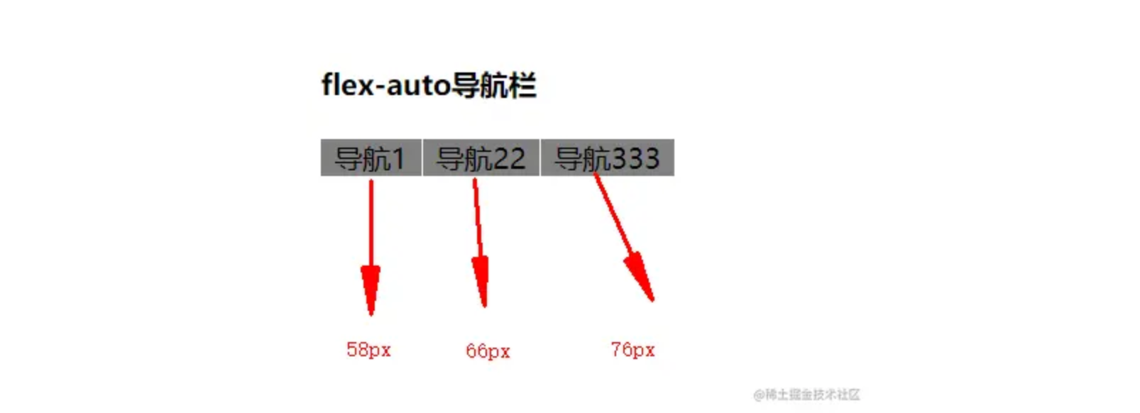 当希望元素充分利用剩余空间,但是各自的尺寸按照各自内容进行分配的时候,适合使用 flex:auto 。例如导航栏。整体设置为 200px,内部设置 flex:auto,会自动按照内容比例进行分配宽度。