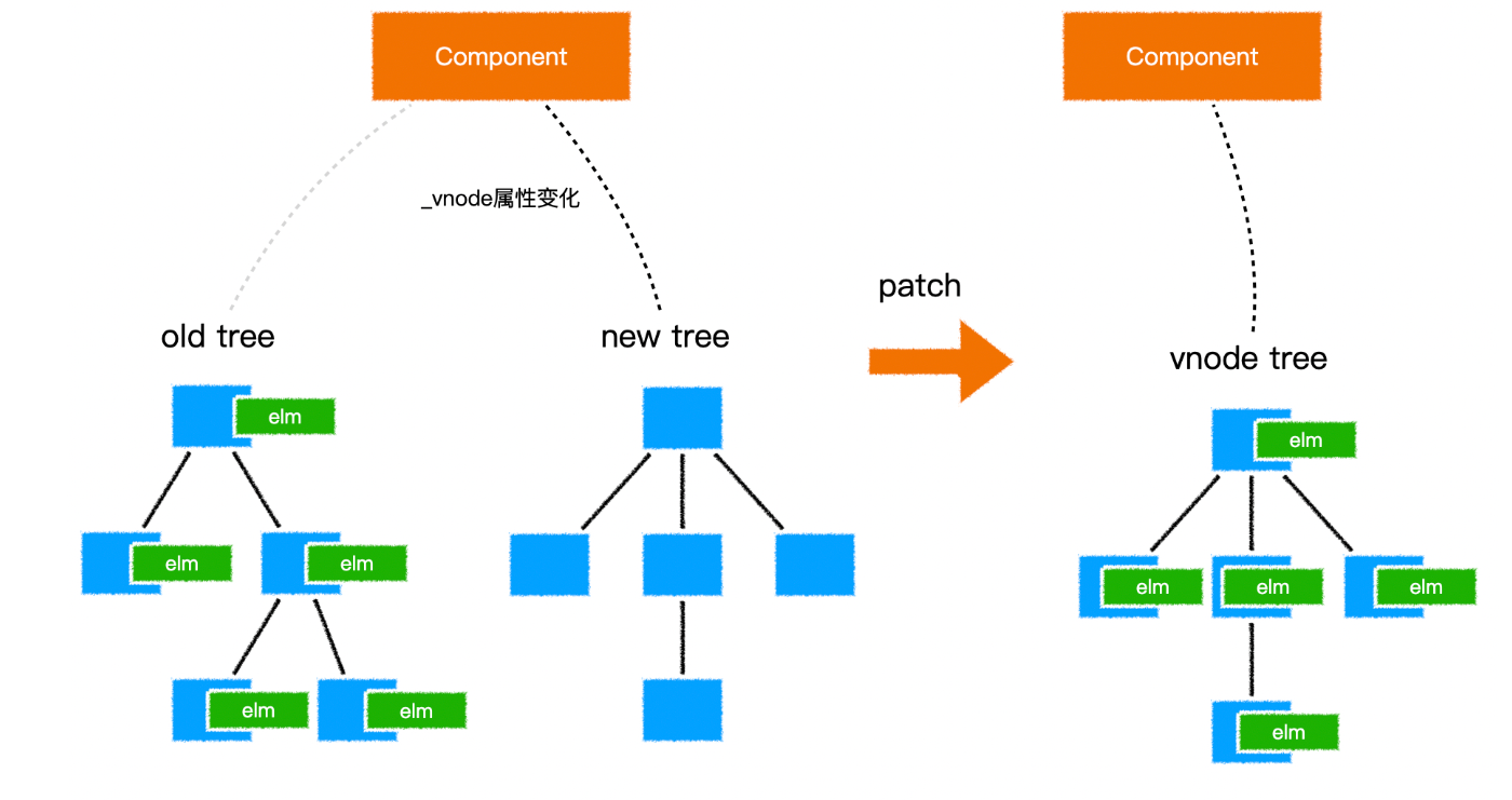_update函数接收到一个vnode参数,这就是新生成的虚拟 dom 树 同时,_update函数通过当前组件的_vnode属性,拿到旧的虚拟 dom 树 _update函数首先会给组件的_vnode属性重新赋值,让它指向新树