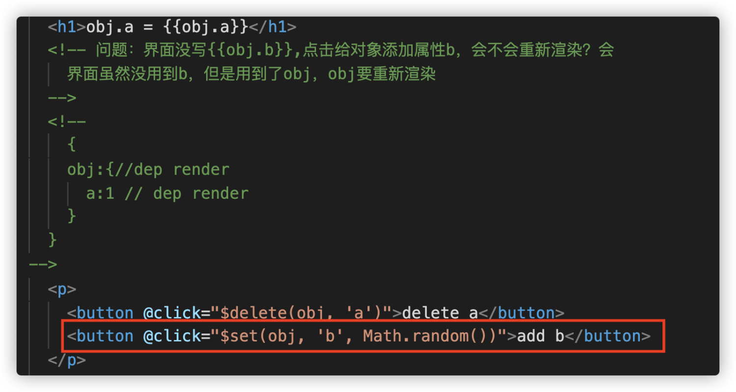由于遍历时只能遍历到对象的当前属性,因此无法监测到将来动态增加或删除的属性,因此 vue 提供了$set和$delete 两个实例方法,让开发者通过这两个实例方法对已有响应式对象添加或删除属性。