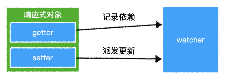每一个 vue 组件实例,都至少对应一个 watcher,该 watcher 中记录了该组件的 render 函数。 watcher 首先会把 render 函数运行一次以收集依赖,于是那些在 render 中用到的响应式数据就会记录这个 watcher。 当数据变化时,dep 就会通知该 watcher,而 watcher 将重新运行 render 函数,从而让界面重新渲染同时重新记录当前的依赖。