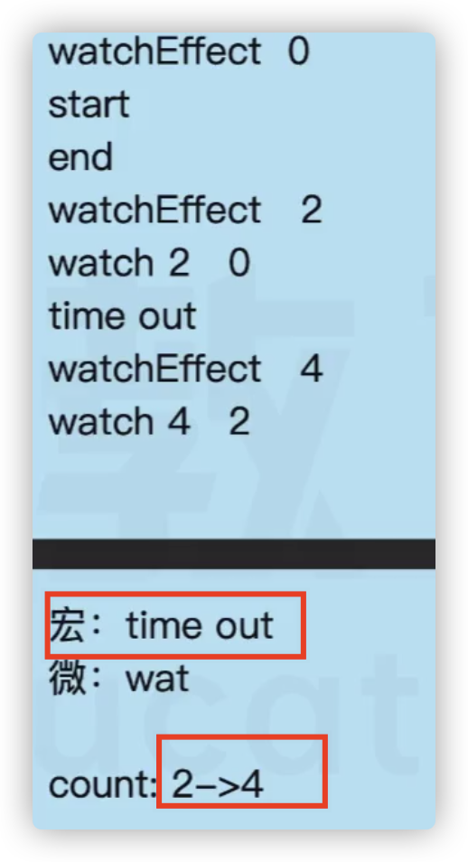 });注意:无论是watchEffect还是watch,当依赖项变化时,回调函数的运行都是异步的(微队列)