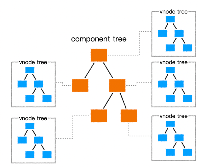 虚拟 dom 本质上就是一个普通的 JS 对象,用于描述视图的界面结构 在 vue 中,每个组件都有一个render函数,每个render函数都会返回一个虚拟 dom 树,这也就意味着每个组件都对应一棵虚拟 DOM 树