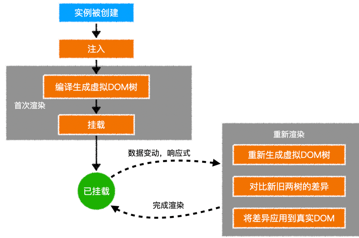 如果一个组件受响应式数据变化的影响,需要重新渲染时,它仍然会重新调用 render 函数,创建出一个新的虚拟 dom 树,用新树和旧树对比,通过对比,vue 会找到最小更新量,然后更新必要的虚拟 dom 节点,最后,这些更新过的虚拟节点,会去修改它们对应的真实 dom