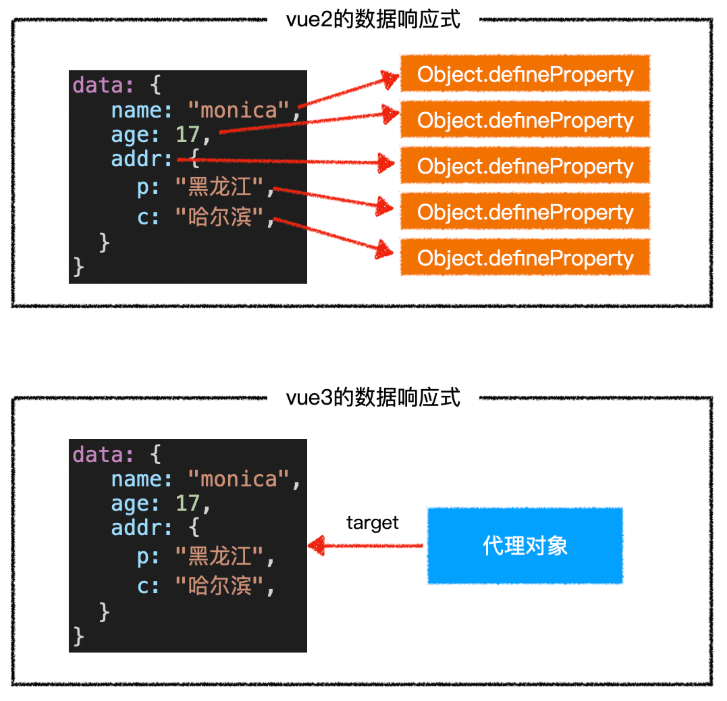 vue2 和 vue3 均在相同的生命周期(beforeCreate 后,created 之前)完成数据响应式,但做法不一样